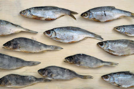 Lined dried fish pattern on a wooden surface. Dried fish product background texture. Food