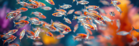 A close-up of a school of small fish swimming together, with their scales shimmering in the light, capturing the beauty of underwater life.