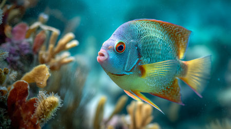 A vibrant tropical fish gracefully swimming in the crystal-clear waters of a coral reef at the bottom of the sea.