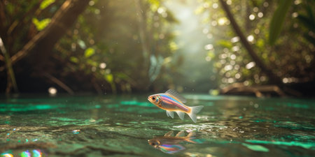 AI Generated. Fish Darting Through Jungle River with Soft Lighting