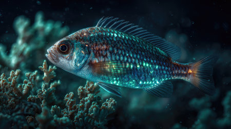 A close-up view presents a fish showcasing intricate scale patterns and textures. The fish resides within a marine environment featuring coral formations. Dark blue and teal hues dominate the color palette. This image may be utilized for educational resources or various design applications.