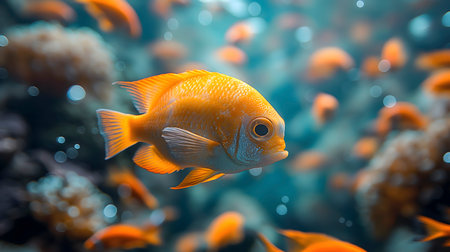 Vibrant orange fish gracefully swim in a serene underwater environment, showcasing their vivid colors against a blurred aquatic background. the scene highlights the beauty and tranquility of marine life in its natural habitat. Generative AI