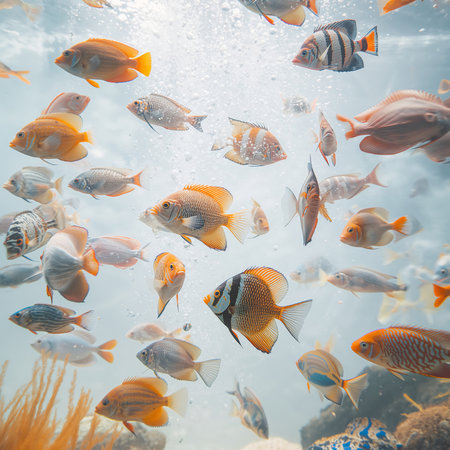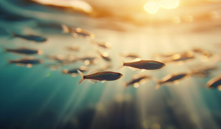 A captivating scene of a school of fish swimming in clear ocean waters, illuminated by soft natural light, creating a serene underwater atmosphere.