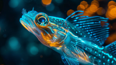 Dive deep into the oceans beauty with this extreme closeup, revealing a mesmerizing fish with glowing scales and piercing eyes.