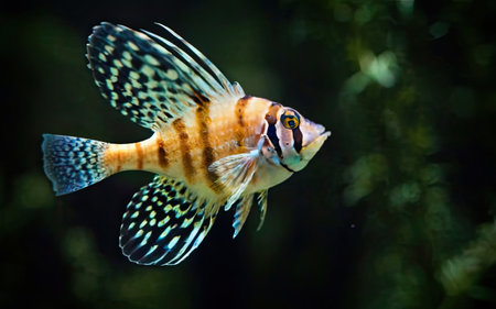 Close up of a colorful fish in aquarium with bokeh background