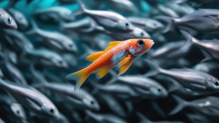 A lone brightly colored fish swimming among a group of identical fish, symbolizing standing out