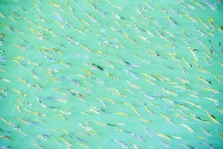 Millions of little fish under the sea water surface that reflects sunlight.