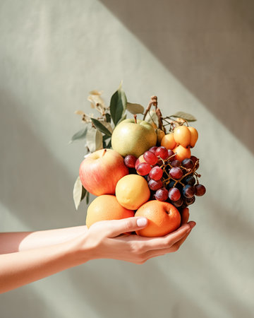 Simple and natural food concept. Artificial intelligence and fruit. Female hands hold many different fruits. Apples, lemon, grapes and small fruits. Soft shadows, natural look. Neutral gray background