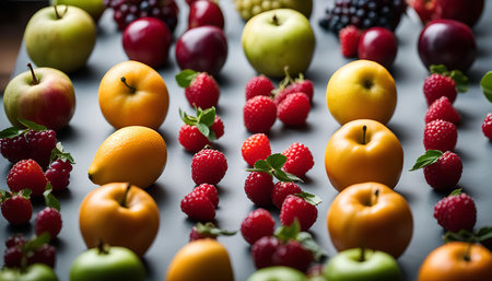 A close-up shot of a colorful and fresh arrangement of various fruits, including apples, raspberries, plums, and grapes, on a dark gray background.