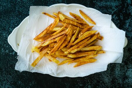 Cajun Seasoned Skinny French Fries Potatoes in Plate with Paper Towels. Ready to Serve Homemade Food.