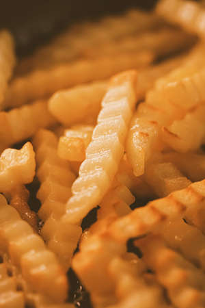 Close-up of several wavy French fries in fryer basket
