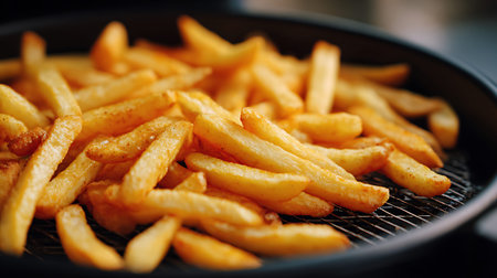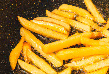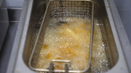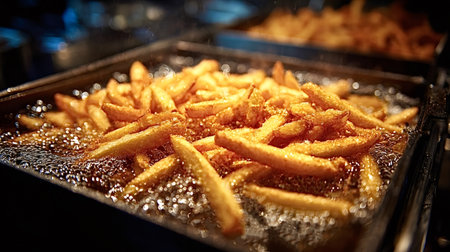 French fries frying in hot, bubbling oil inside a deep fryer at a bustling restaurant, creating a tempting and indulgent snack that is both delicious and undeniably unhealthy