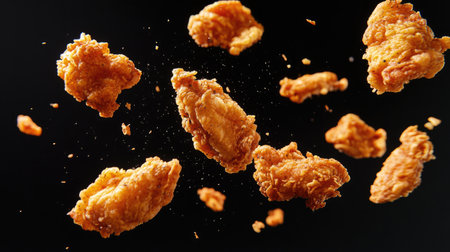 Fried chicken pieces falling from above, golden and crispy, isolated on a black background