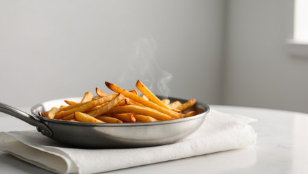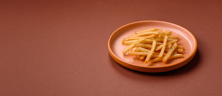 AI Generated. Crispy Golden Fries Placed Artfully on White Plate on Light Fabric Background with Empty Copy Space for Culinary Text and Promotions