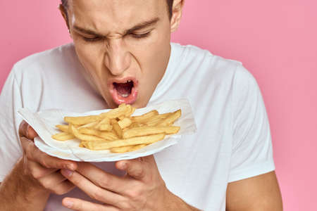 Man with French fries in a paper box on a pink background calories fast food portrait pink background