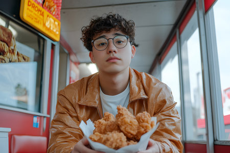 young man in eyeglasses eating fried chicken in fast food restaurant