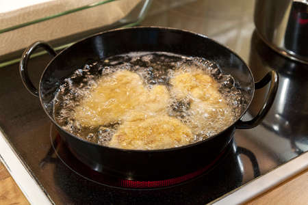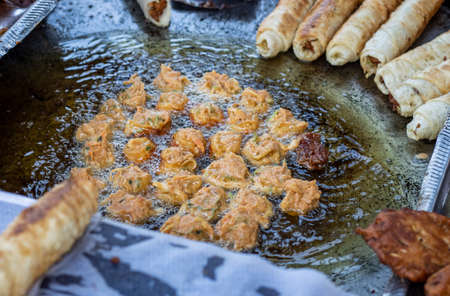 Delicious snacks are frying on the stove with oil close up shot