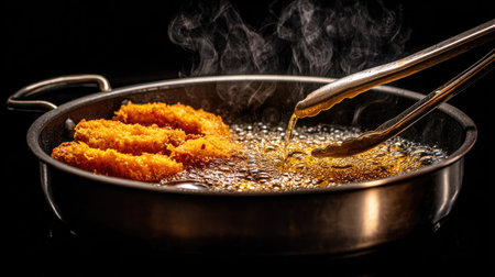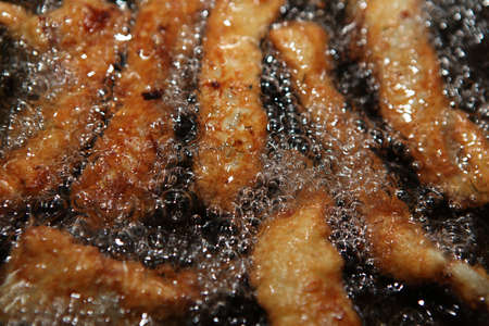 Delicious bites cook in hot oil bubbling and turning golden brown filling the air with savory aromas.