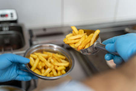 Close up on hands of unknown man entrepreneur with blue rubber protective glove putting potato chips french fries in metal plate at the fast food restaurant in day top view