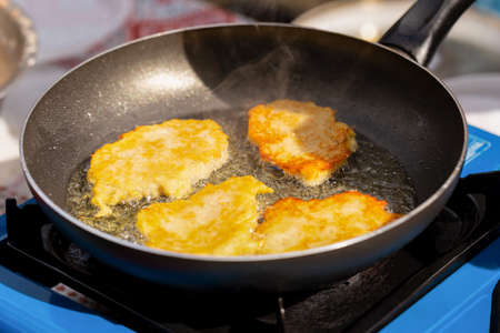 Appetizing potato pancakes are fried in a pan. Foodcord. Top view
