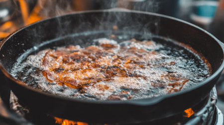 Close-up of sizzling bacon cooking in a cast iron skillet, with the grease bubbling and the edges turning crispy and brown.