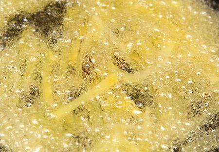 French fries are fried in oil in a pan. Close-up
