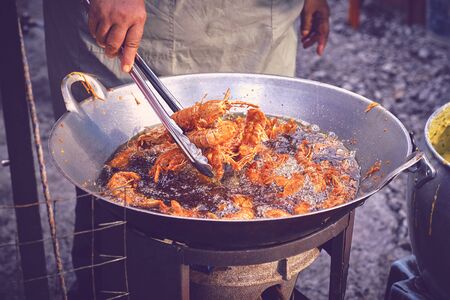 King shrimp tails cooking. Close up of Frying Shrimps in the fryer in hot oil.
