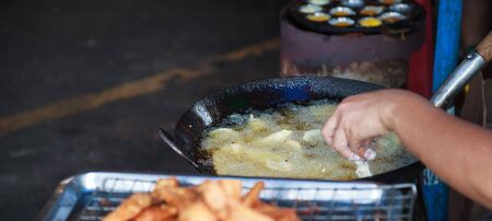Selective Focused Traditional Thai Street Food Snack, Deep fried Cassava with breadcrumbs on market stall. Tropical fruit and produce food process to desserts, sweets, treats and snacks concept