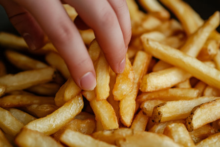 A hand playfully reaches for a golden French fry among a heap of crispy fries, highlighting the vibrant colors and making the food look irresistible.