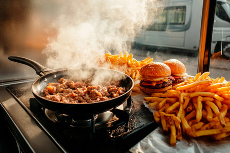 A bustling food stall serves mouthwatering burgers and crispy fries while aromatic steam rises from a sizzling skillet, capturing the essence of joyful outdoor dining at dusk.