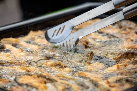 Cook tempura chicken nuggets in deep fryer. One piece in cooking tongs. close up