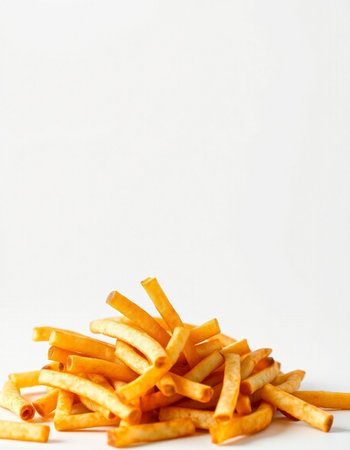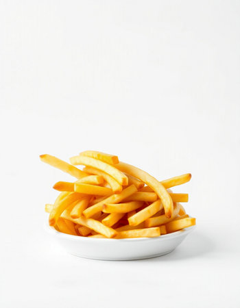 Golden French fries potatoes on a white background with space for text.