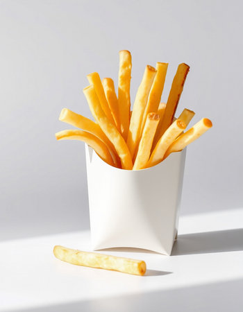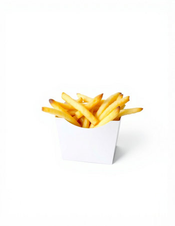 French fries in a white box on a white background, fast food