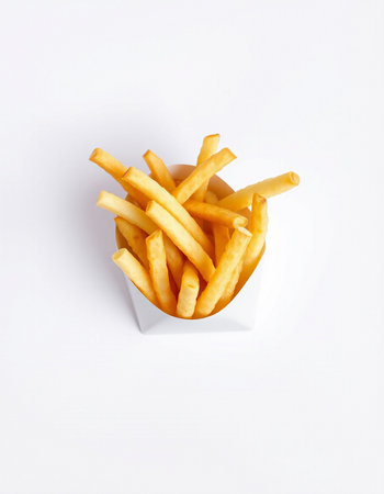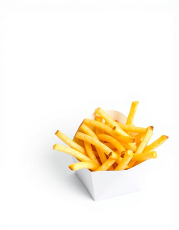 French fries in a white box on a white background with copy space