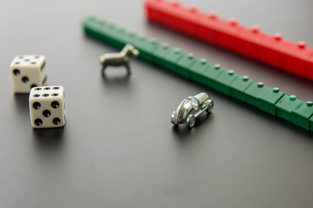 February 8, 2015 - Houston, TX, USA. Monopoly houses and hotel rows with dice, car and dog