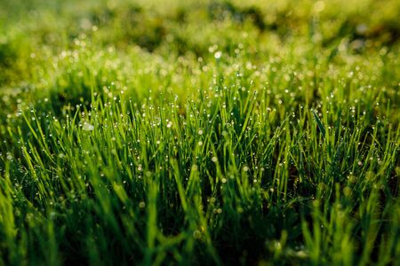 Green grass with dew drops in sunset light. Nature background.