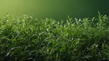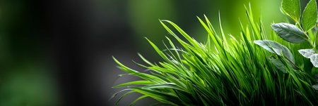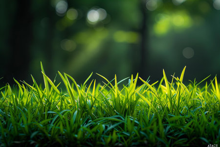 Lush green grass blades in a close-up view, illuminated by soft sunlight creating a textured and vibrant natural...