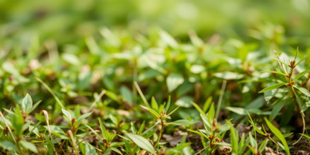 A close-up view of lush green grass with a shallow depth of field, showcasing individual blades and small plants in soft focus.
