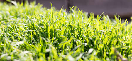 Close up of young green grass in the garden. Nature background.