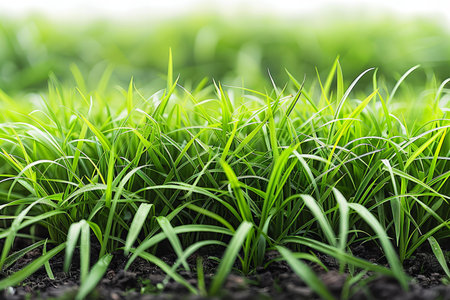 Blades showing extreme close-up macro shot of lush green grass blades with soft bokeh background and natural...
