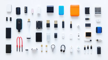 Small electronic devices such as USBs, earphones, and chargers are organized neatly on a clean white surface, optimal for showcasing technology.