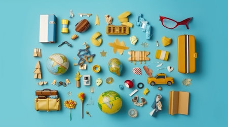World Tourism Day. Accessories for recreation top view. hot tours. vacation time. Generative AI