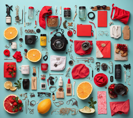 Various everyday objects are meticulously organized on a flat surface, displaying a diverse array of colors, shapes, and textures that evoke curiosity and nostalgia.