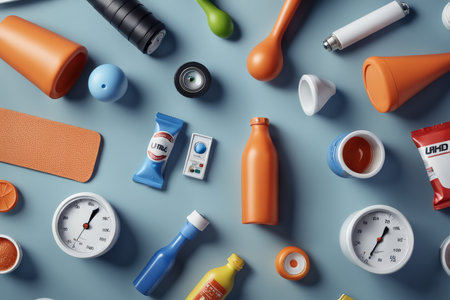 A diverse collection of small, everyday items made from plastic and metal, arranged neatly on a clean white surface, captured from a top-down perspective.