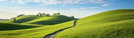 Stunning spring landscape of Tuscany rolling green hills and a scenic path at sunrise
