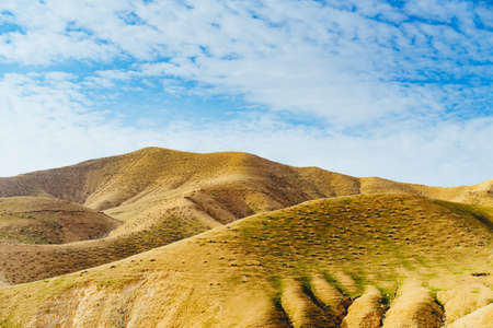 Beautiful green hills and blue sky with white clouds in the background