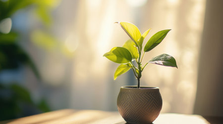 A small green plant in a minimalist pot is bathed in warm, soft sunlight, creating a serene and calming atmosphere perfect for home decor.