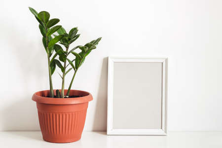 Tropical potted plant Zamioculcas and empty photo frame against white wall. Scandinavian interior fragment.