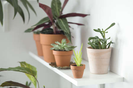 The modern room filled a lot of plants in red clay pots. Stylish composition of the shelf.