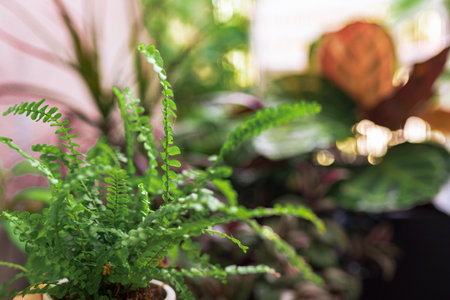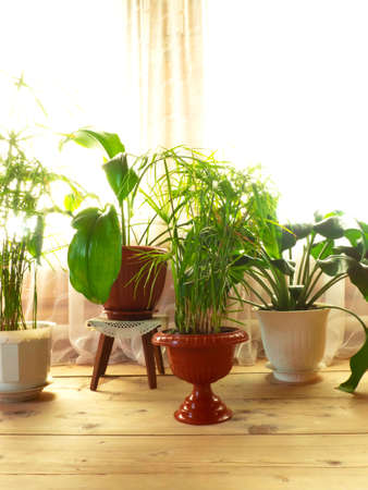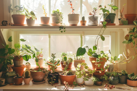 Dense, lush green spring houseplants and flower pots on windowsill against bright sun with blurry background, warm tones, natural lifestyle mood, fresh, botanical hobby